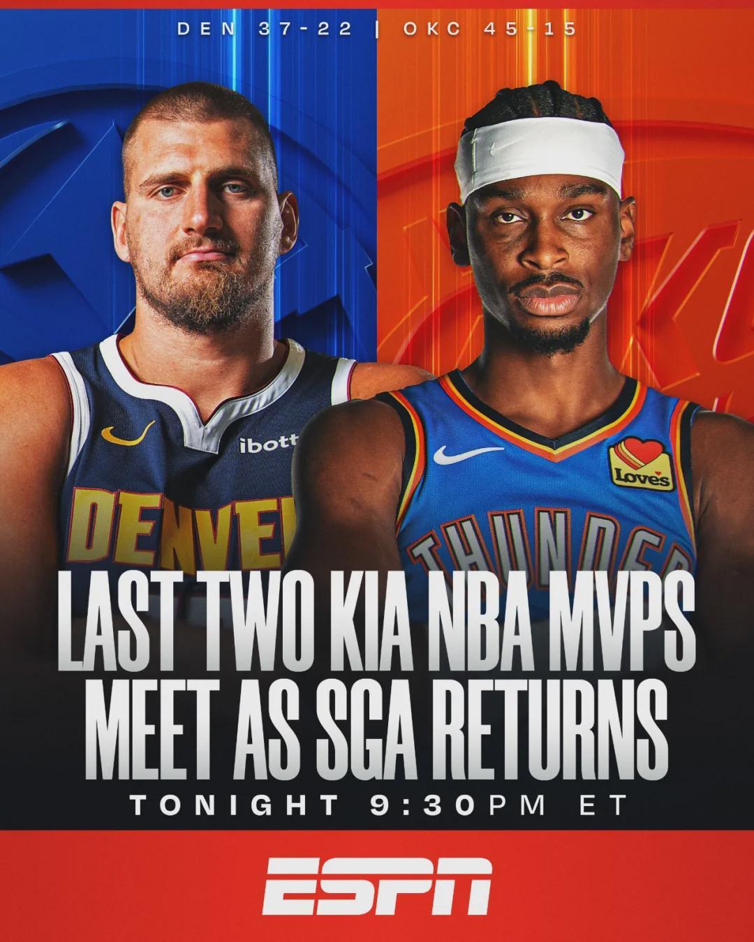 北京时间2月28日,NBA常规赛:雷霆主场vs掘金,亚历山大正式复出。亚历山大因为腹部拉伤,已经连续缺席9场比赛。雷霆45胜15负西部第一,仅领先马刺1.5个胜场。而且雷霆的胜率已经被活塞反超,活塞44胜14负联盟第一。