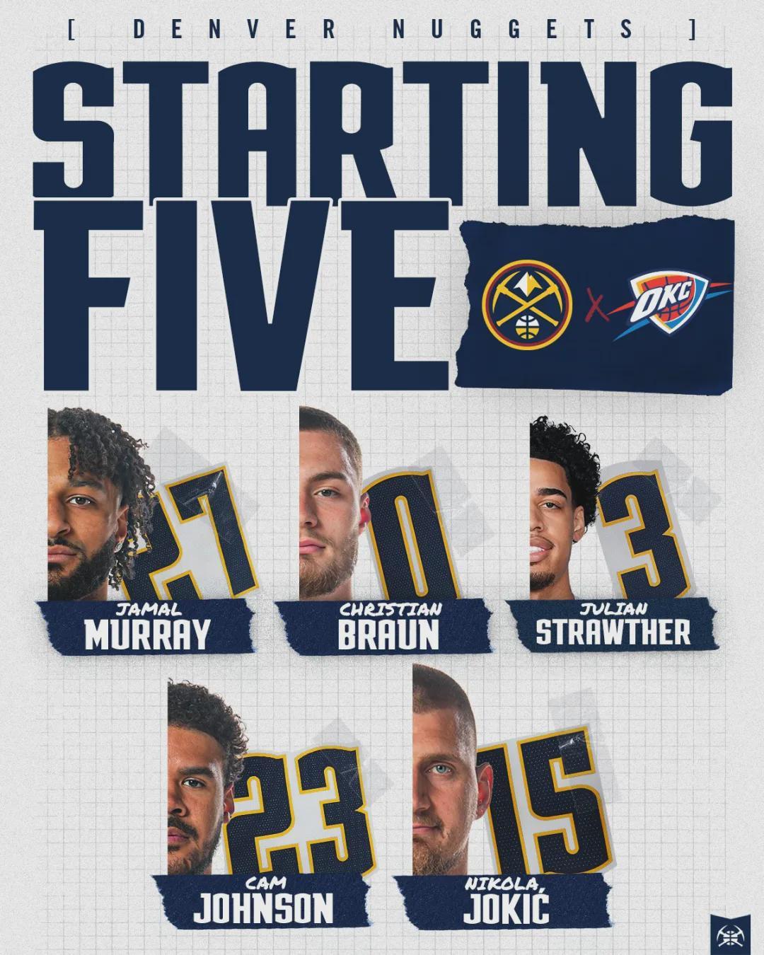 雷霆本场首发:亚历山大、卡森-华莱士、多尔特、霍姆格伦、哈尔滕斯泰因。掘金首发:穆雷、布劳恩、斯特劳瑟、卡梅伦-约翰逊、约基奇。说回比赛,约老师开局手感不佳,首节投篮8中2。但其他队友够准,掘金单节三分11中7!