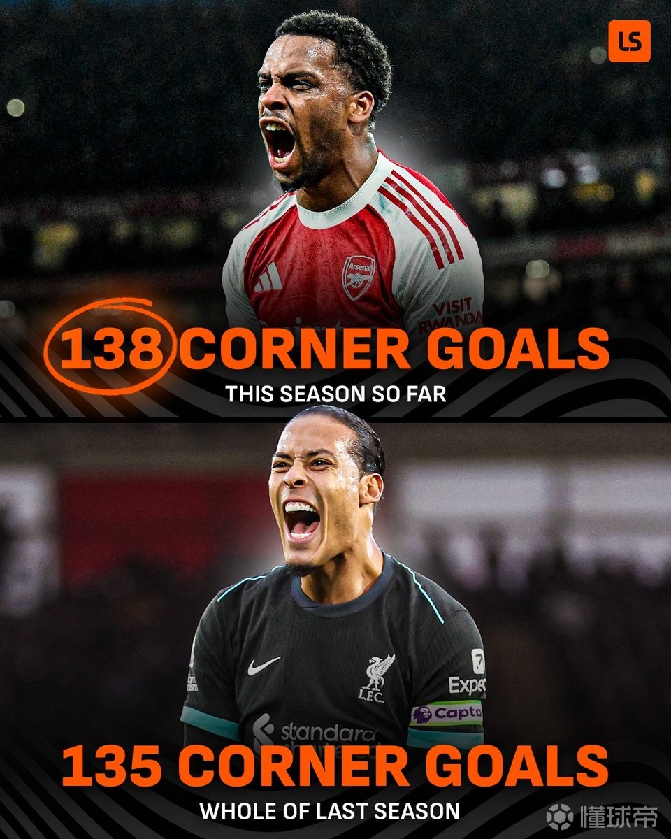 根据LiveScore的统计,本赛季英超前28轮过后(阿森纳和狼队多赛一场),共计281场比赛已经出现了138粒通过角球完成的进球,超过了上赛季135球的总和,而本赛季的英超还剩余10轮,还有接近100场比赛,上述138球的数据无疑会进一步增加。