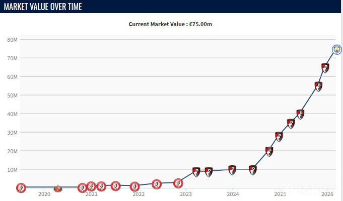 2024年5月时他的身价为1000万欧元,同年10月上涨至2000万欧元,12月,他的身价上涨800万欧元,达到2800万欧元,之后分别上涨至3500万欧、4000万欧、5500万欧和6500万欧。