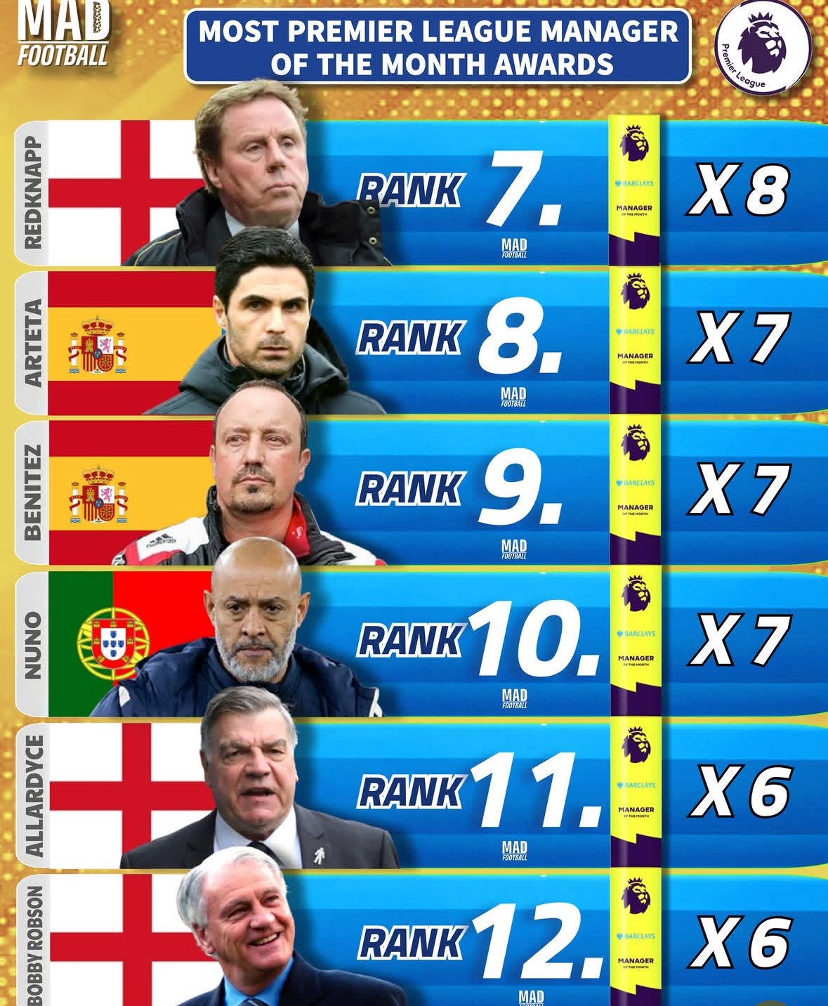 英超历史上获得过最多月度最佳主教练的排行榜: