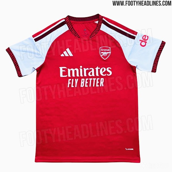 从曝光的图片来看,这件球衣主体依旧使用阿森纳标志性的红色,但在细节处加入了更深的酒红色元素。球衣的衣领、袖口以及肩部阿迪达斯经典“三条纹”部分的色调元素,均采用酒红色设计,与主体红色形成对比,增加视觉层次。