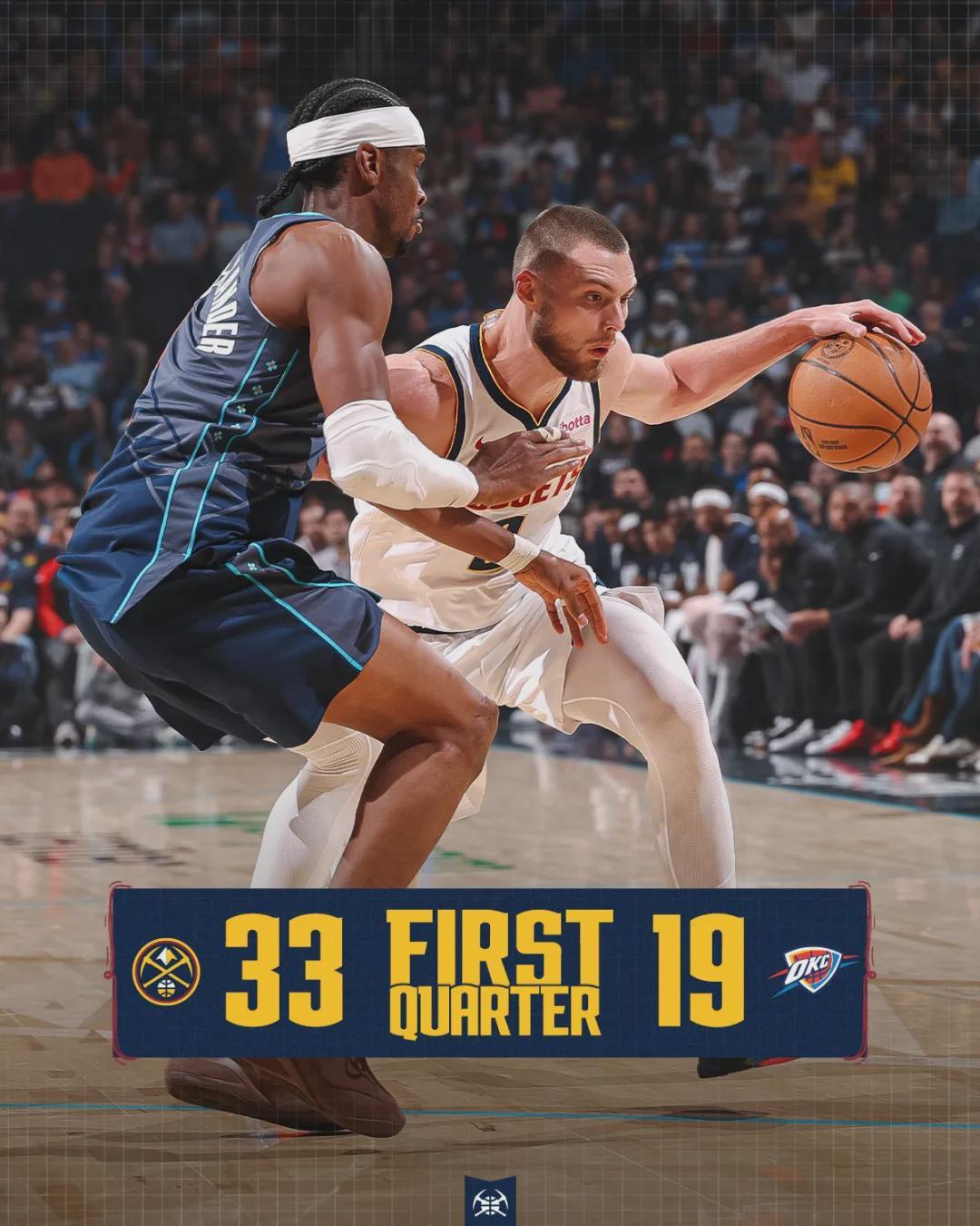 第一节打完,掘金33-19领先雷霆14分。约基奇单节6分9篮板3助攻,亚历山大8分1助攻。场上摩擦不断,多尔特抢篮板时拉拽约老师的球衣,阿隆-维金斯又跟约老师互相推搡。第二节初段,约老师在场下休息,雷霆一波流追到2分。