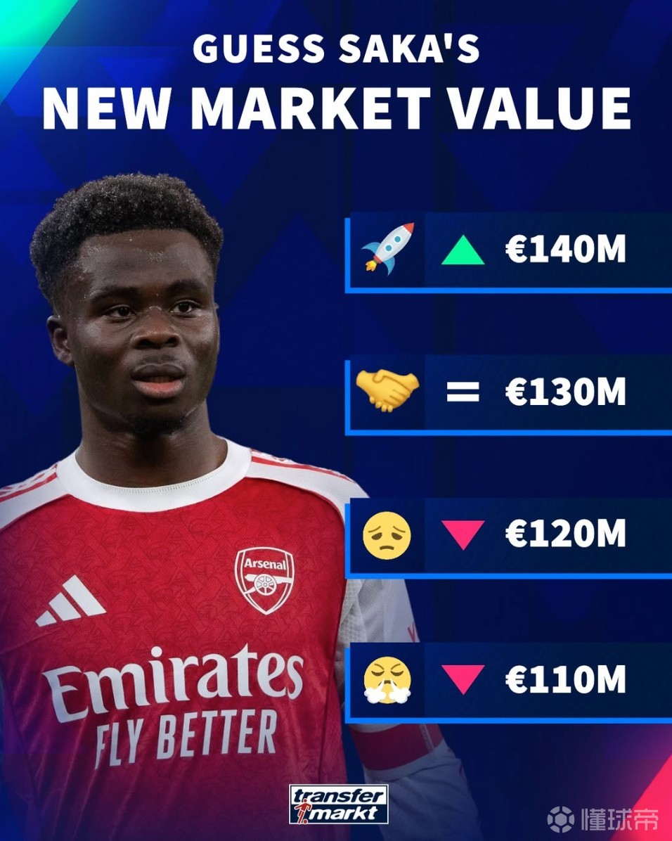 北京时间3月5日,德转预热了萨卡的身价更新,最高涨至1.4亿欧元,最低1.1亿欧元。