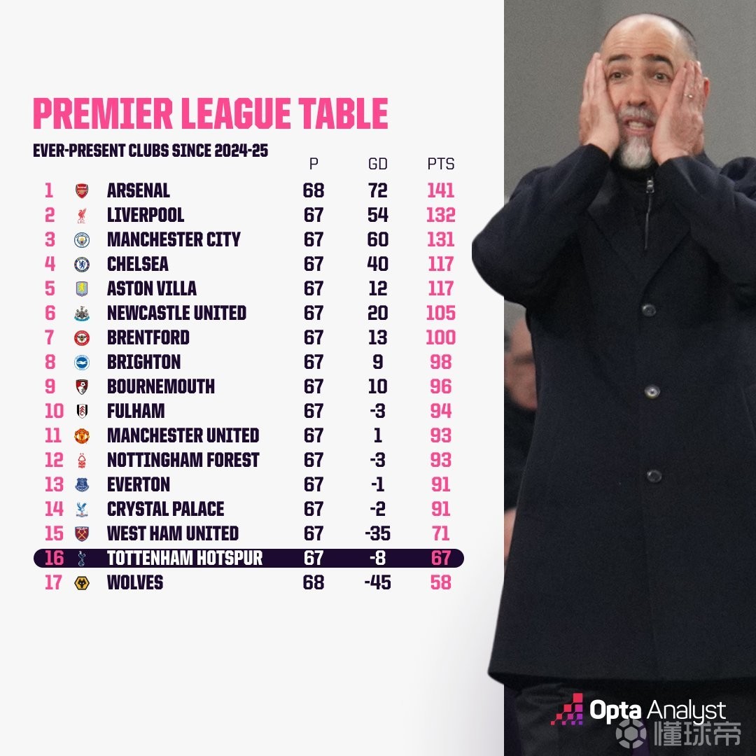 16. 托特纳姆热刺 67场 净胜球-8 67分