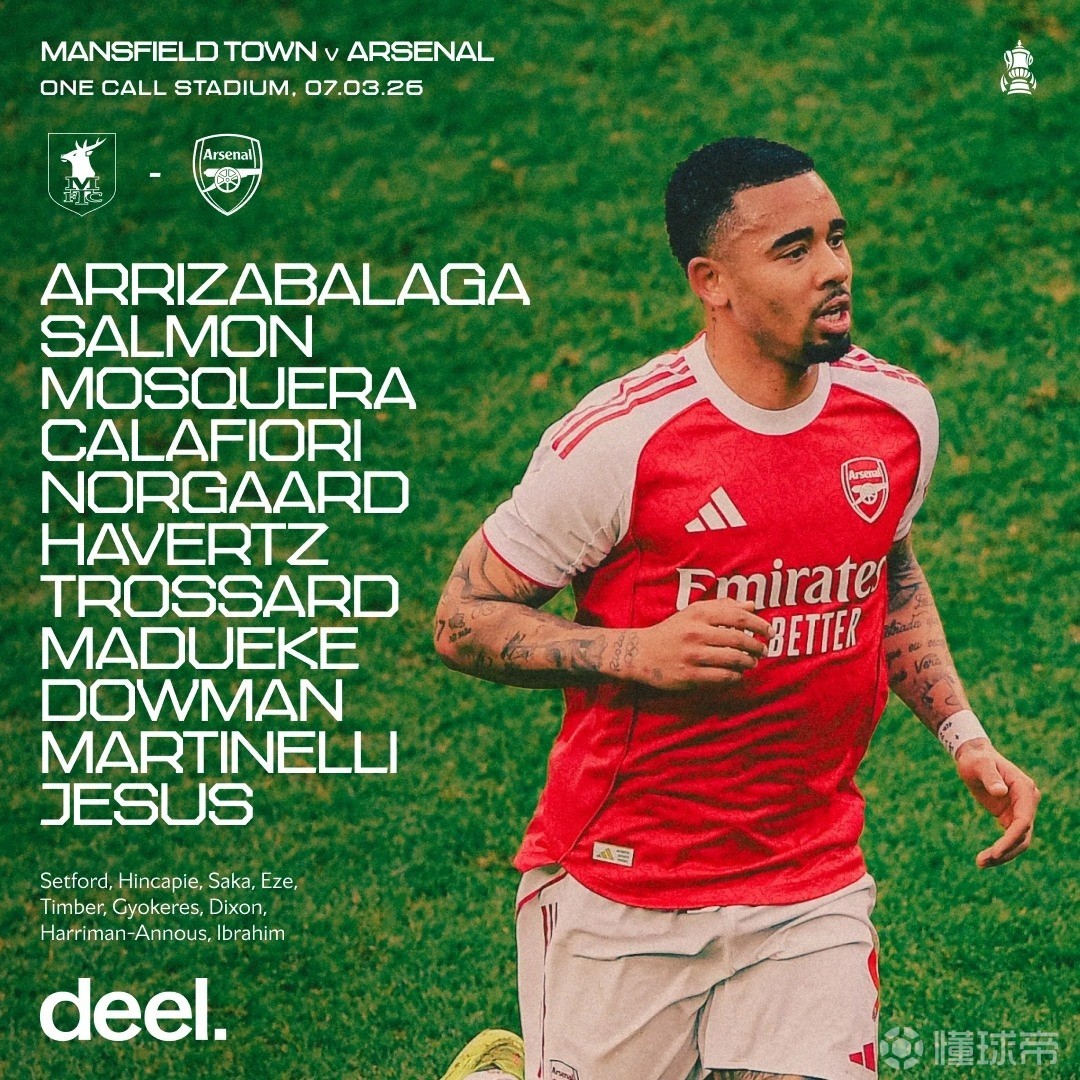 阿森纳首发:13-凯帕、89-马利-萨蒙、3-莫斯克拉、33-卡拉菲奥里、16-内尔高、56-道曼、20-马杜埃凯、11-马丁内利、29-哈弗茨、9-热苏斯、19-特罗萨德