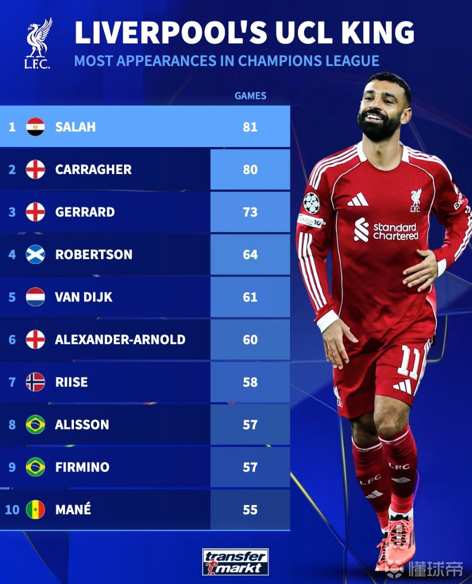北京时间3月11日,德转统计出了利物浦队史欧冠出场数前10,首发出战了与加拉塔萨雷1/8决赛首回合的萨拉赫也就此以81场超越卡拉格独占红军队史欧冠出场数第1。