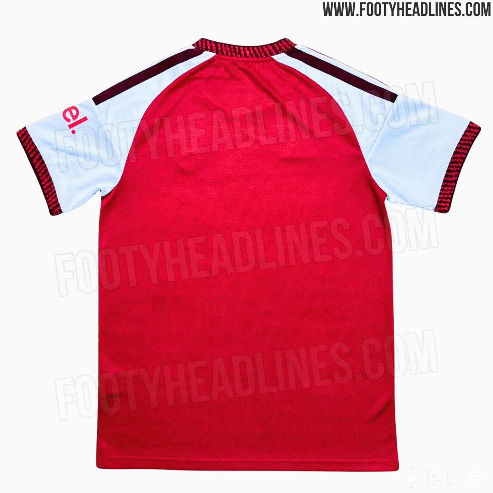从曝光的图片来看,这件球衣主体依旧使用阿森纳标志性的红色,但在细节处加入了更深的酒红色元素。球衣的衣领、袖口以及肩部阿迪达斯经典“三条纹”部分的色调元素,均采用酒红色设计,与主体红色形成对比,增加视觉层次。